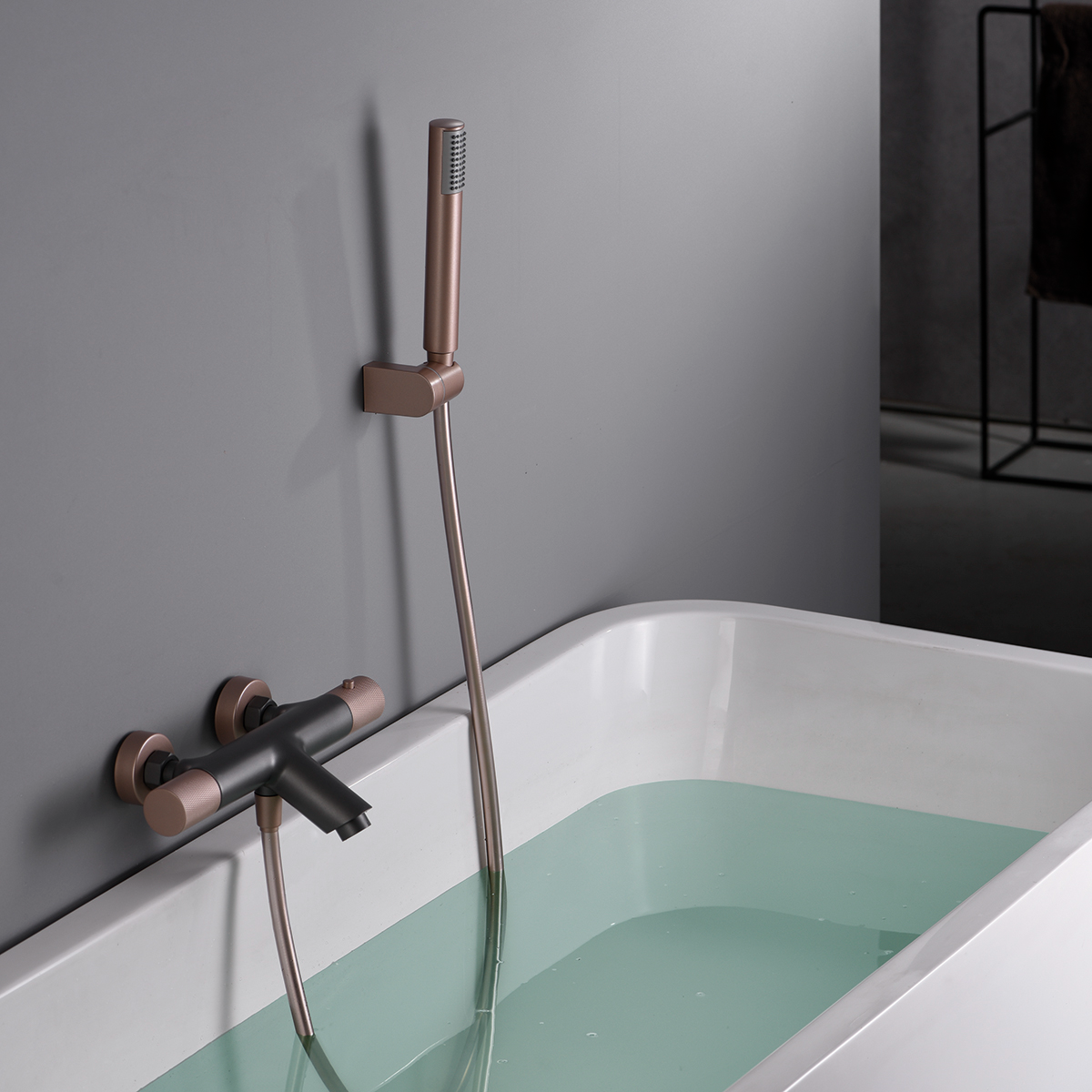 - Mosiężna termostatyczna bateria wannowo-prysznicowa z wbudowanym rozdzielaczem.