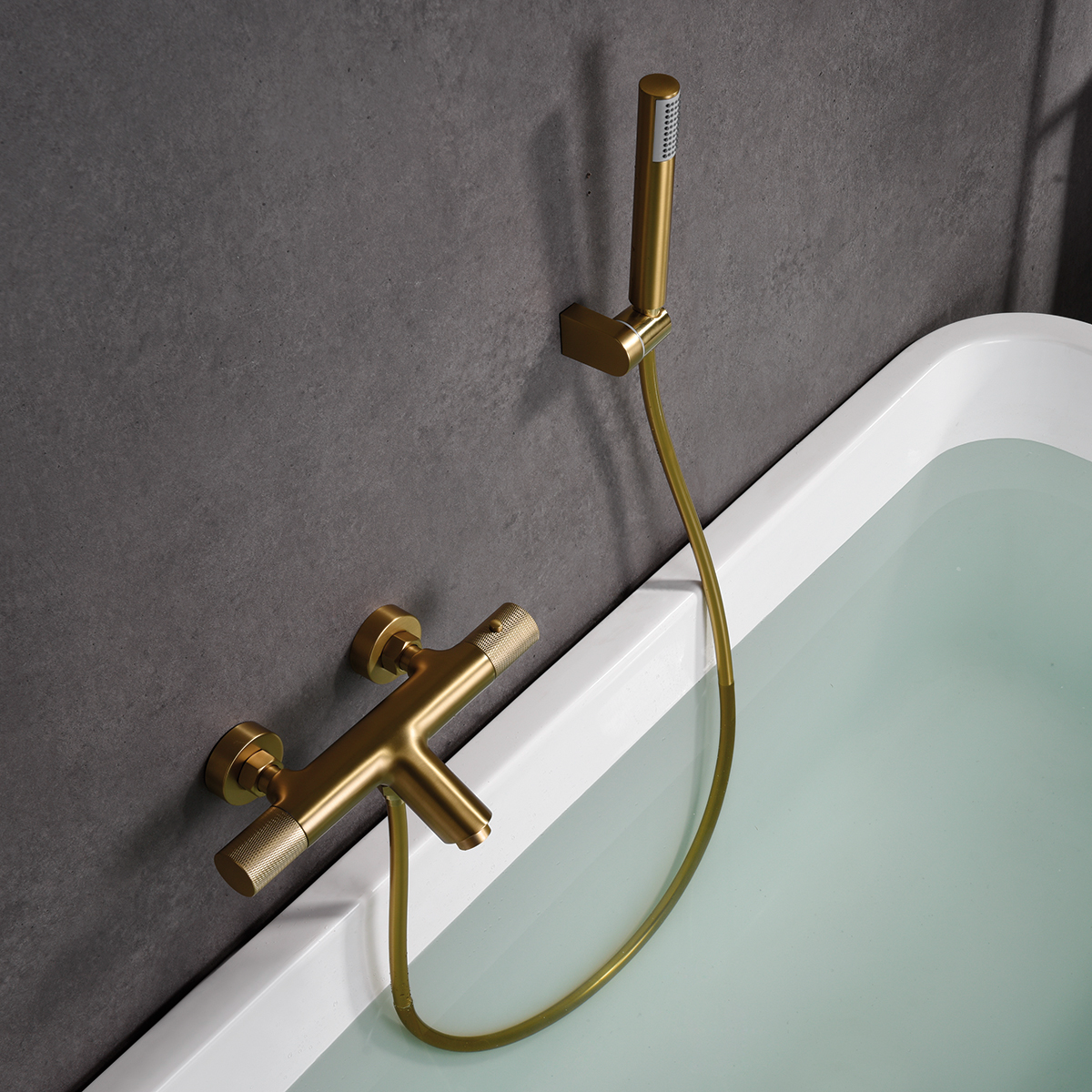Line | Bateria wannowa termostatyczna ścienna z kompletem natryskowym szczotkowane złoto